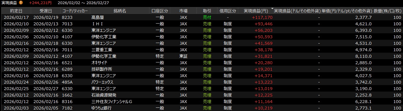 1月同様4107伊勢化学工業と6330東洋エンジニア、それに加えて7013IHIでよく利が取れていました。