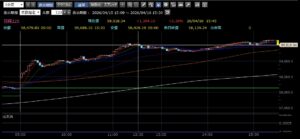 日経は上がり調子だったしここも騰がるかなって思ったんです。そしたらエントリーが天井付近だったわけですね。15分足で5本線の上を乗っているしエントリーのタイミングとしては遅いけど悪くはないと思うんです。その後損切りのタイミングを逃してしまったのが大きい。昼をまたぐべきではありませんでしたね。