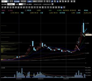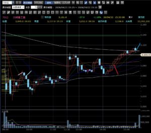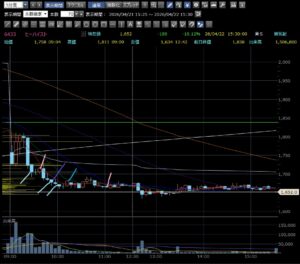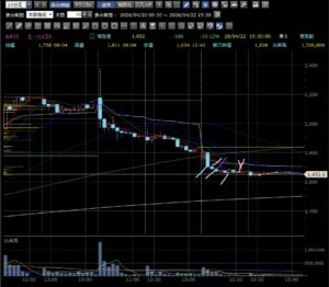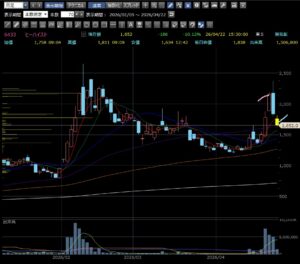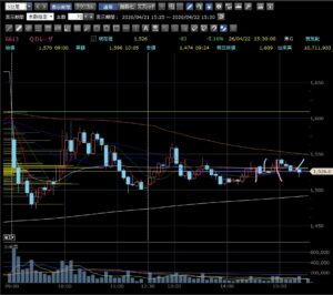 後場はこの銘柄を完全に放置していました。赤い線でエントリーして最後の青い線で利確すれば他よりよほど利益が出ました。